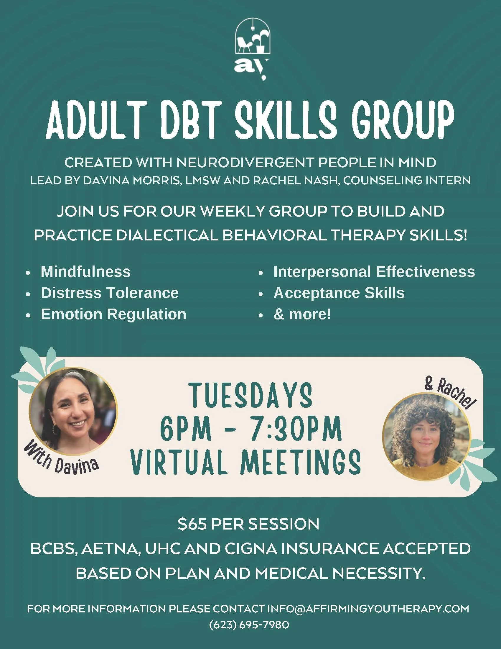 Designed with Neurodivergent Adults in mind, this group teaches skills to support everyday well-being through mindfulness, emotional regulation, distress tolerance, and managing your sensory needs. Join this supportive in-person group and connect with other neurodivergent adults in the Phoenix area!